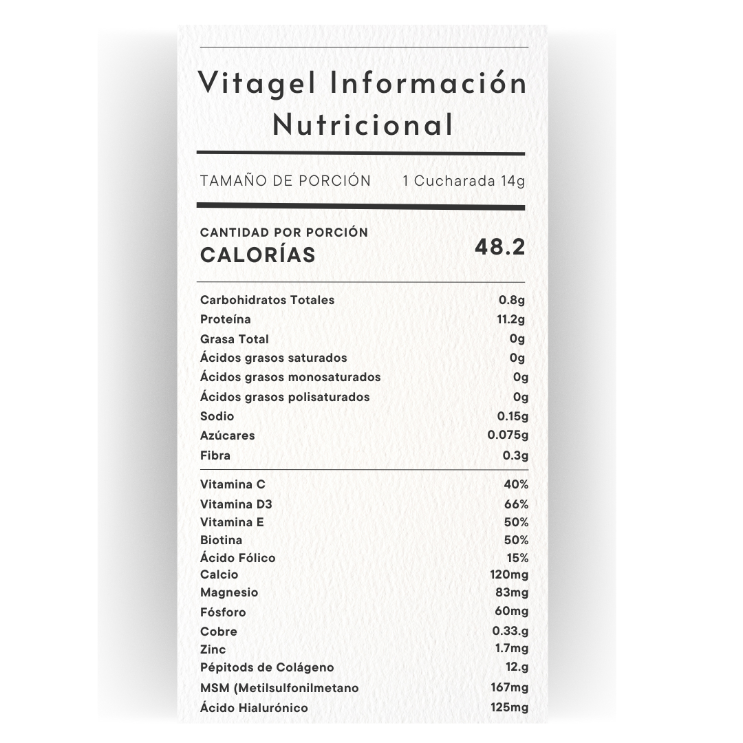 Vitagel Skin Beauty, con su gran composición de colageno hidrolizado que lo hace increíble, ahora mejoramos la fórmula con ácido hialurónico y antioxidantes, único con cobre y msm en el mundo, te compartimos nuestro secreto para una belleza única, rejuvenece tu piel disminuyendo líneas de expresión, da brillo a tu cabello y fortalece las uñas.